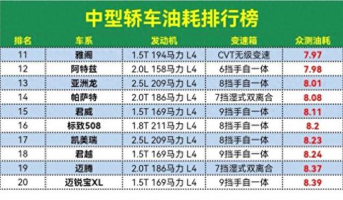 具体看看前十名的油耗,名图油耗7.28,索纳塔、起亚K5、亚洲龙、凯美瑞都仅7.3几的油耗,标致508、迈腾油耗7.6左右,日产天籁、凡尔赛C5 X、英仕派都进前十名,油耗都不超7.9,都有着不错的油耗表现。