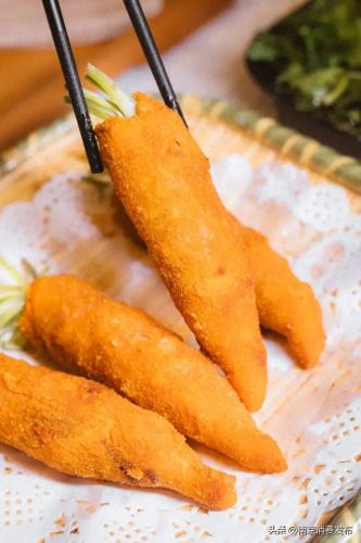 里头是烤鸭丝,外头是新鲜的鱼片。裹粉油炸之后,再插上香菜梗,一条栩栩如生的胡萝卜鱼就制作完成了。