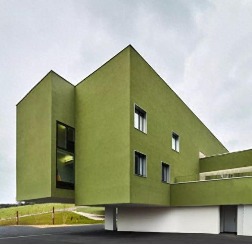 为了让养老院显得不那么突兀,减少视觉上的冲击,建筑师将其拆分为几部分建造并在项目中使用了绿色的元素,使养老院和周围风景融为一体的同时也体现出了周边环境的乡土自然气息。