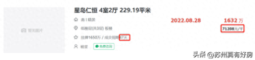 上一次成交还是去年8月,成交面积为229.19㎡,成交单价达到71208元/㎡。