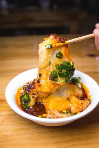 这道洋芋酿皮,就是拿洋芋擦丝磨成粉挤干水分,再摊成饼蒸熟,最后炒着吃,口感软糯中带着韧劲,菜籽油香配着洋芋淀粉独到的口感,能吃出一丝肉味。它更是当地夜市的开盘好戏:将切成长条的洋芋酿皮,撒上盐与辣椒面,来一曲“孜然炉火”,就是烧烤摊上最下酒的好菜。