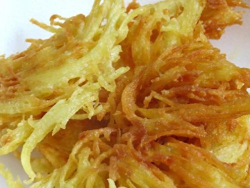 土豆到了南方,就逐渐低调了,像上海人的“洋山芋色拉”,土豆、火腿、青豆、蛋黄酱齐舞,吃的是中西合璧,“海派”味道;或是如普陀山上的素斋“金丝绣球”一类的菜,用豆腐加以菌菇打成泥,调味后做出丸子。外层炸至酥脆的土豆丝不仅细如发丝,且要根根均匀,出锅晶莹透亮,好看大于好吃,吃成了一种艺术。