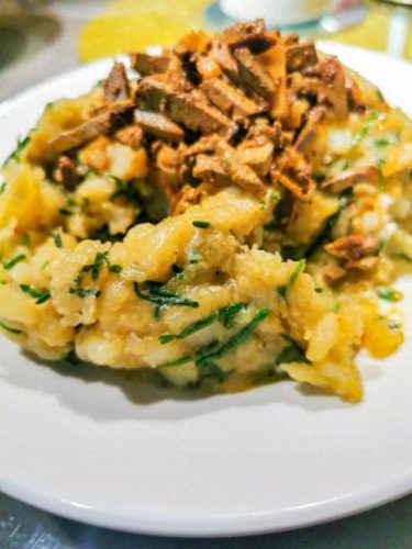 在山西,你还可以吃到土豆馕糕、浑源土豆凉粉、糍山药圪撅(土豆面鱼鱼)、过油肉土豆片……山西岚县人民深爱土豆,甚至办了场土豆盛宴,研制出108种吃法,用土豆模拟出如同鲍鱼、辽参的菜品。这些吃法里比较有名的就是捣拿糕了,土豆大火蒸,小火焖,再去皮,用名为“抿拐拐”的器具捣100多下,才能“一团和气”。