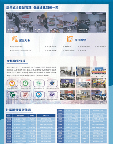 【培养时间】:今年7月下旬开始在公办大专金牌专业衔接班校外指定培培养培训基地集训,明年下半年送入省内公办大专院校。